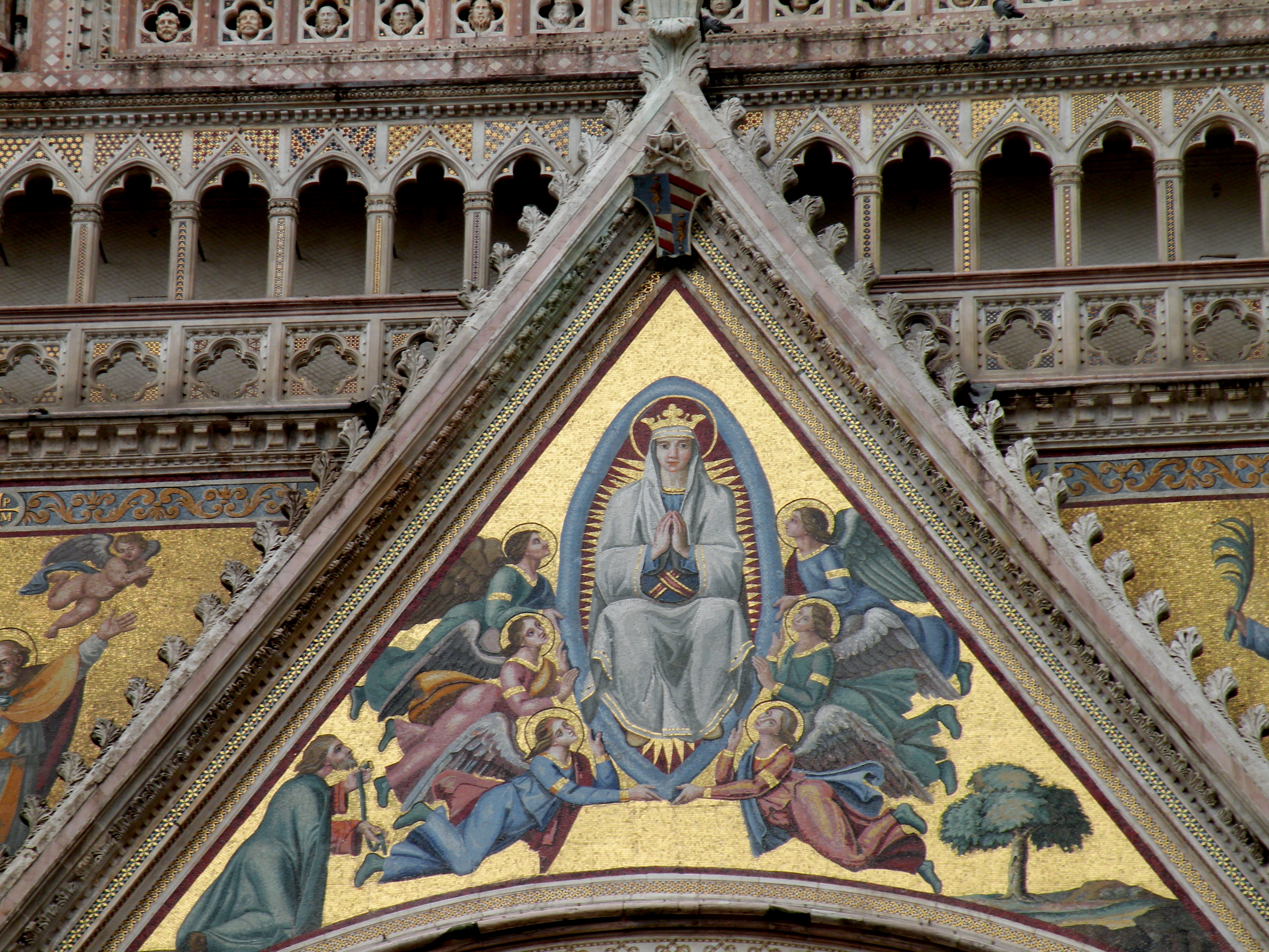 Arrivati di fronte alla facciata ci rende conto che è valsa ogni “fatica”. Il portale è semplicemente meraviglioso: fortemente strombato vi sono scolpite scene del Vecchio e del Nuovo Testamento, Santi, Apostoli e ai lati una Annunciazione. L’interno, dal puro stile gotico, ospita ben tredici cappelle con affreschi, tra cui una bella Madonna con Bambino di Masolino da Panicale, dai colori soffusi. Nella cripta si conservano i resti di San Fortunato e altri Santi insieme a quelli di Jacopone da Todi.