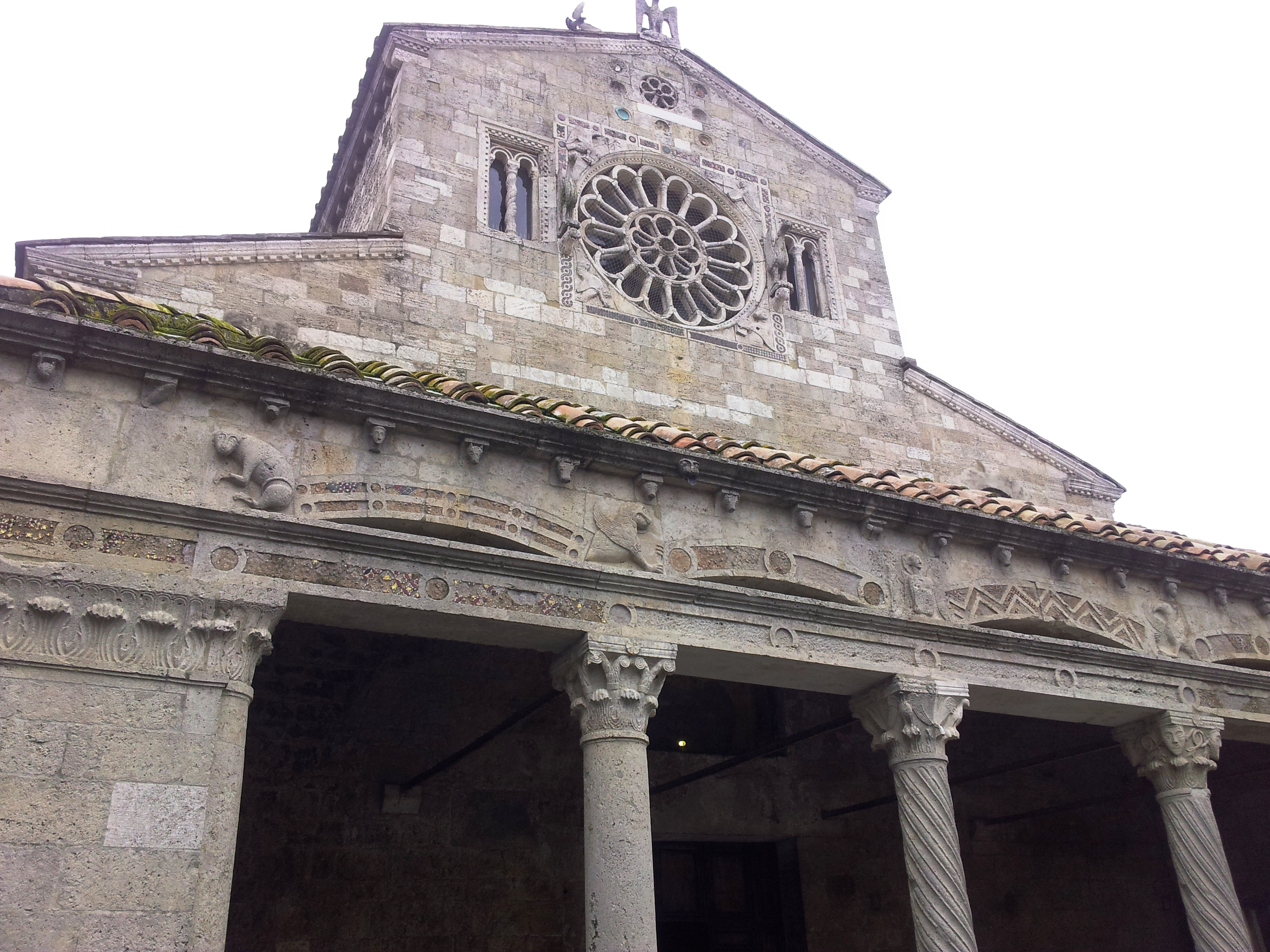 Preceduta da un portico sorretto da colonne tortili e lisce e con decorazioni cosmatesche sull’architrave e sugli archi, la facciata si presenta con grande rosone centrale a doppio giro di colonnine, affiancato da due grifoni e da bifore. Molto ricca la decorazione scultorea. Sopra le colonne sono inseriti i bassorilievi raffiguranti i simboli degli evangelisti. Ai lati sono raffigurati animali ed esseri mostruosi.