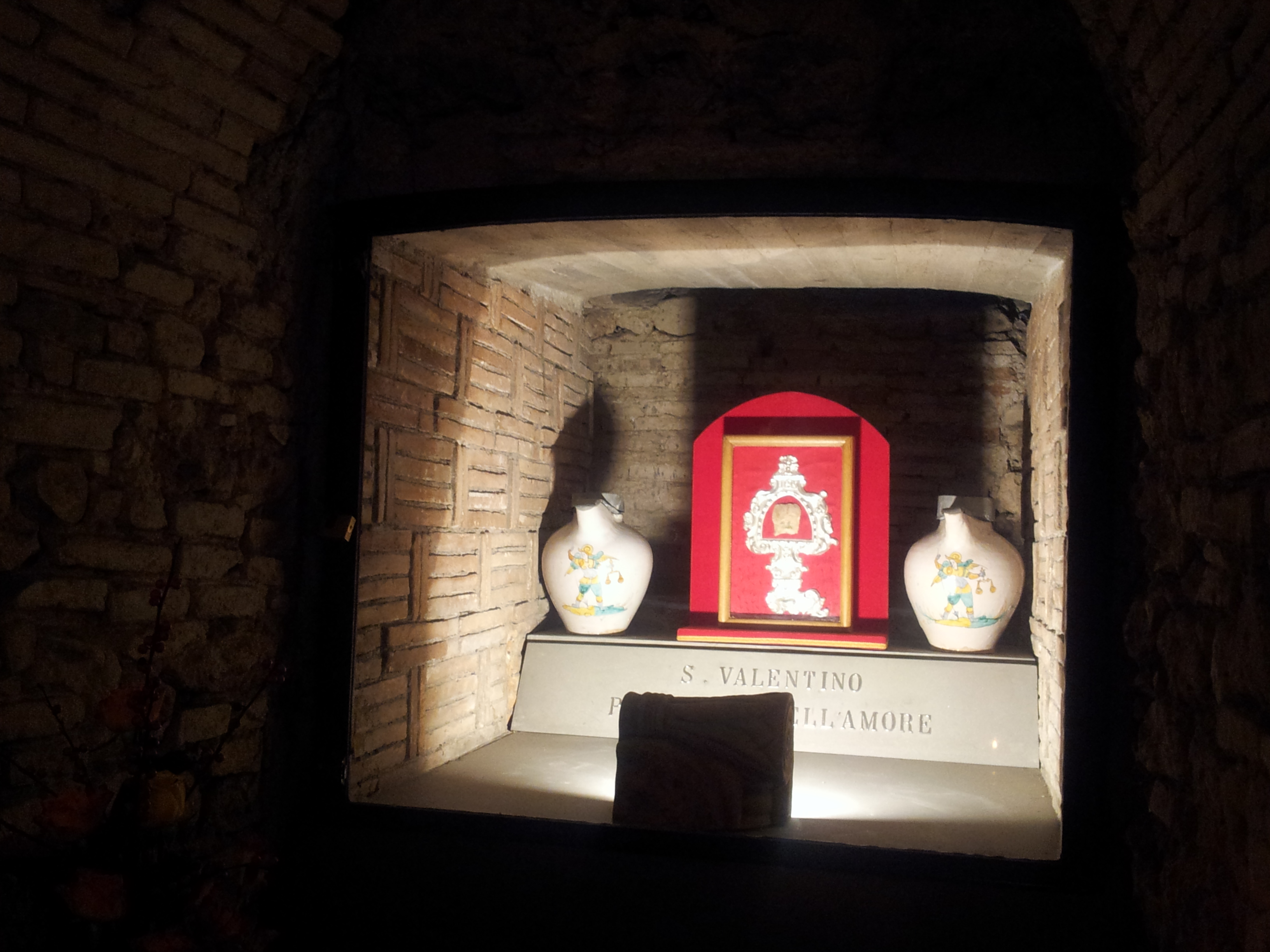 Nel 1693, dopo una nuova ricognizione, le reliquie del santo (parte del cranio, mascella con pochi denti, ossa ed altre parti del corpo) vennero collocate in una statua argentea supina, posta in una’artistica arca di bronzo sotto l’altare maggiore in marmo. Sopra l’altare un dipinto mostra San Valentino che invoca su Terni la protezione della Madonna, opera di pregevole fattura di frate Luca, carmelitano e pittore di scuola fiamminga.