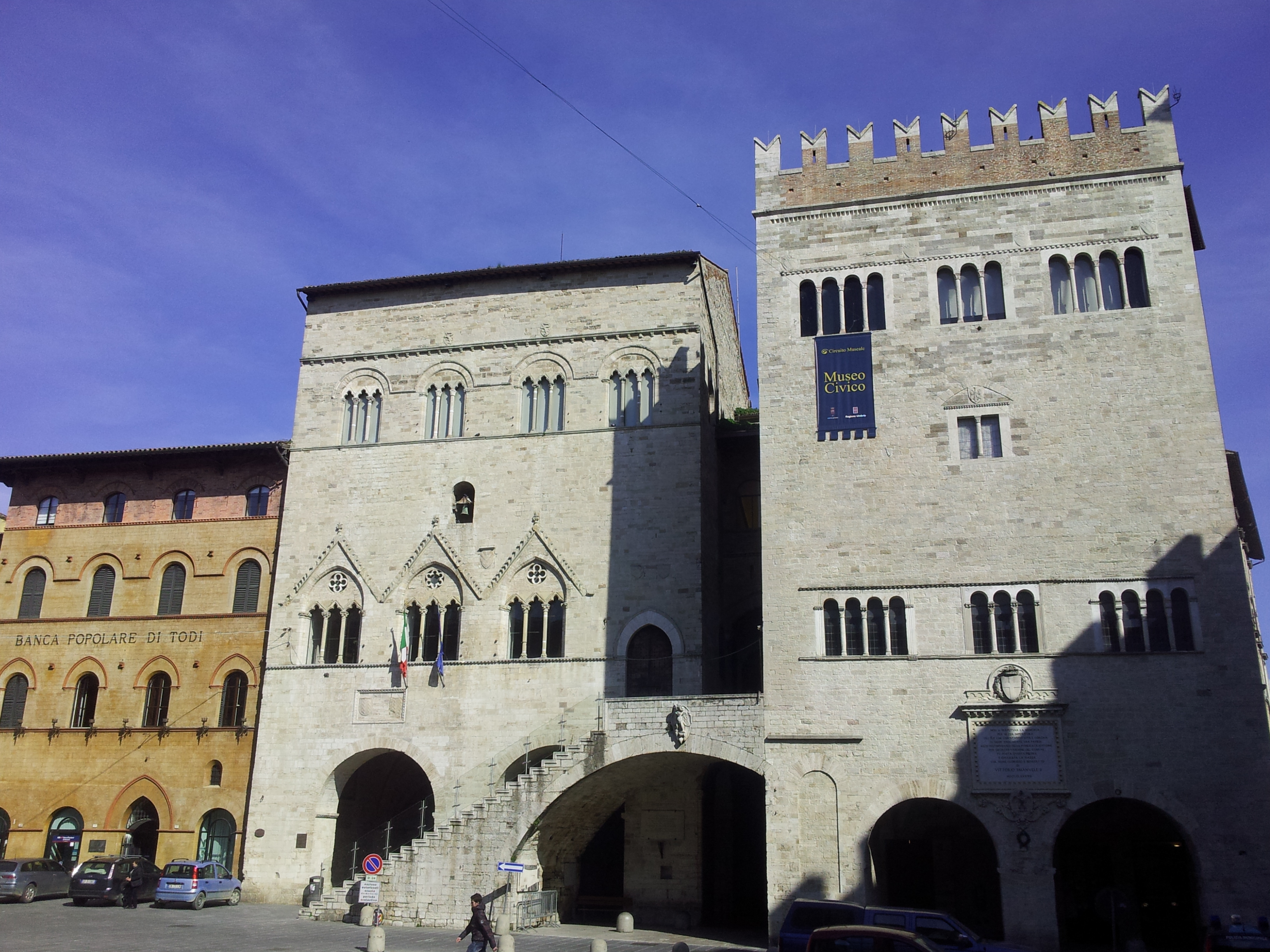 Tornando indietro con una brevissima passeggiata si arriva a Piazza del Popolo, considerata tra le più belle d’Italia: monumentale, ariosa, dove si concentra l’arte, la storia e lo splendore. Vi si affaccia la Cattedrale dell’XI secolo (all’interno in contrafacciata “Giudizio Universale” di Ferraù di Faenza) e i Palazzi comunali: Palazzo del Capitano, Palazzo del Popolo e Palazzo dei Priori. Negli ultimi due piani dei palazzi comunali si trova il Museo Pinacoteca. Notevole la sala delle ceramiche, affrescata agli inizi del Settecento con storie di Todi e con bella raffigurazione del territorio della città, realizzata nel 1612 dal pittore locale Pietro Paolo Sensini.