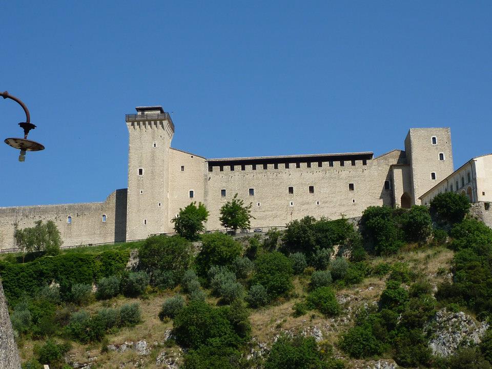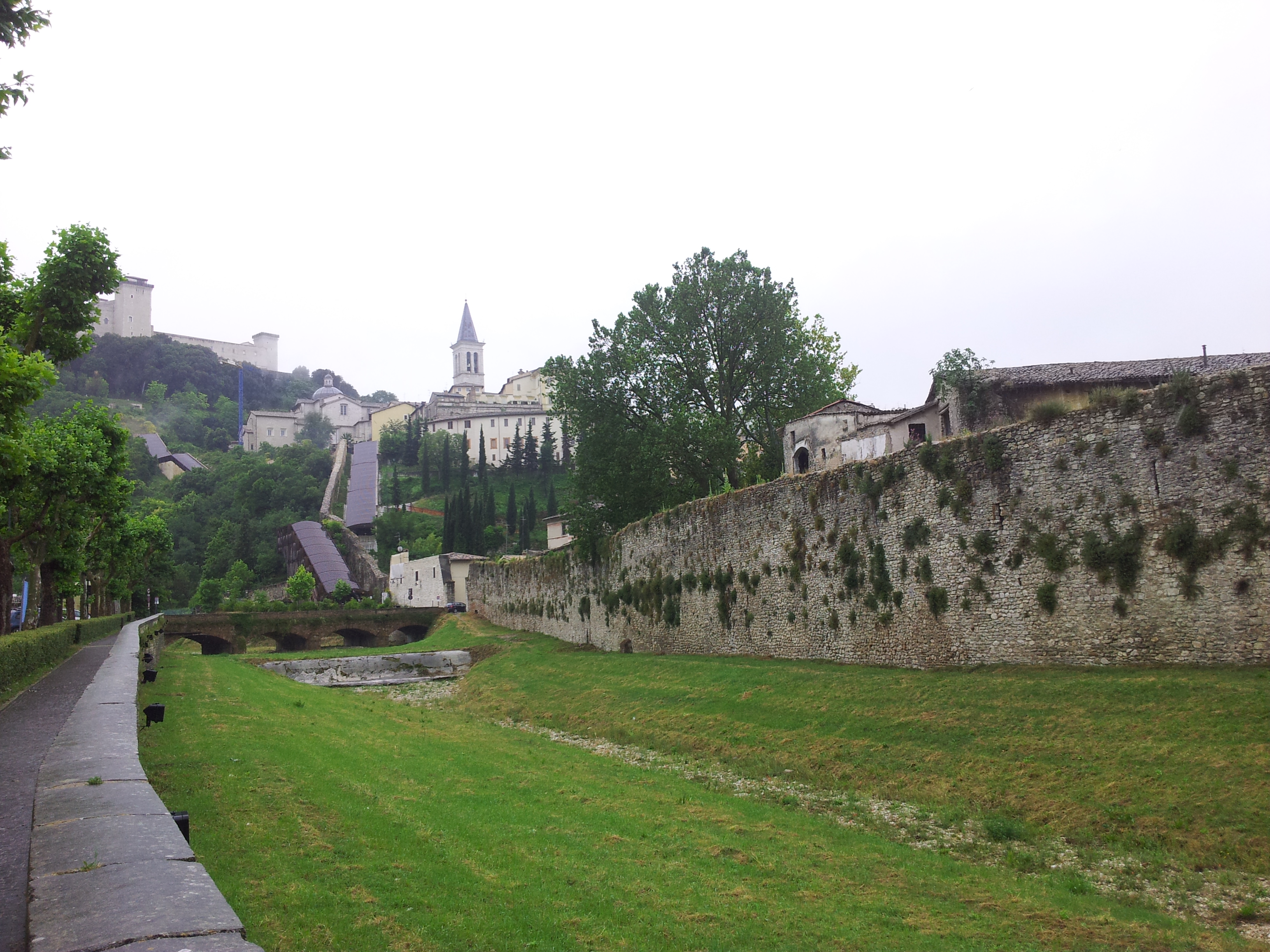 La via che costeggia la Rocca, via del Ponte, fiancheggiata da un tratto di mura romane poligonali, permette di arrivare in pochi minuti a piedi di fronte al suggestivo panorama sul Monteluco e dal Ponte delle Torri.